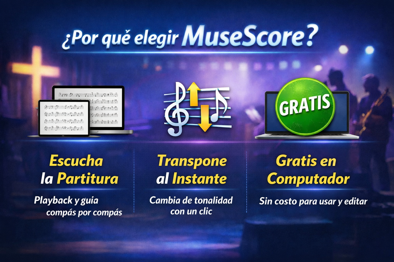 - MuseScore es gratis en computador: no necesitas comprar software para abrir, escuchar, transponer y editar el archivo (.mscz).